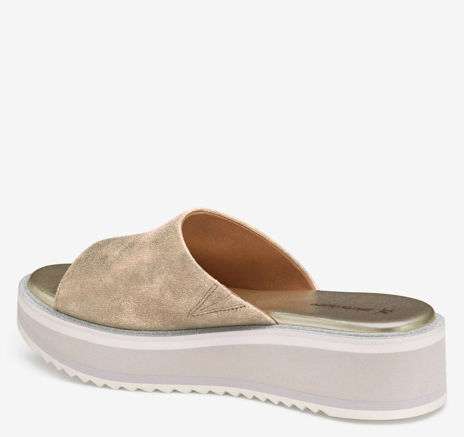 - Cushioned footbed covered in metallic leather offers all-day comfort.