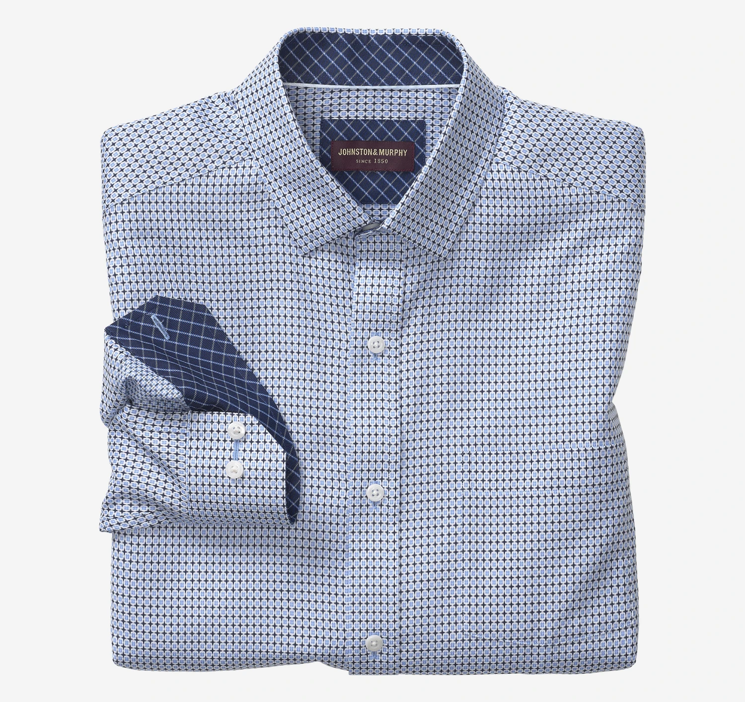 - Contrast facing inside collar and button cuffs on select styles.