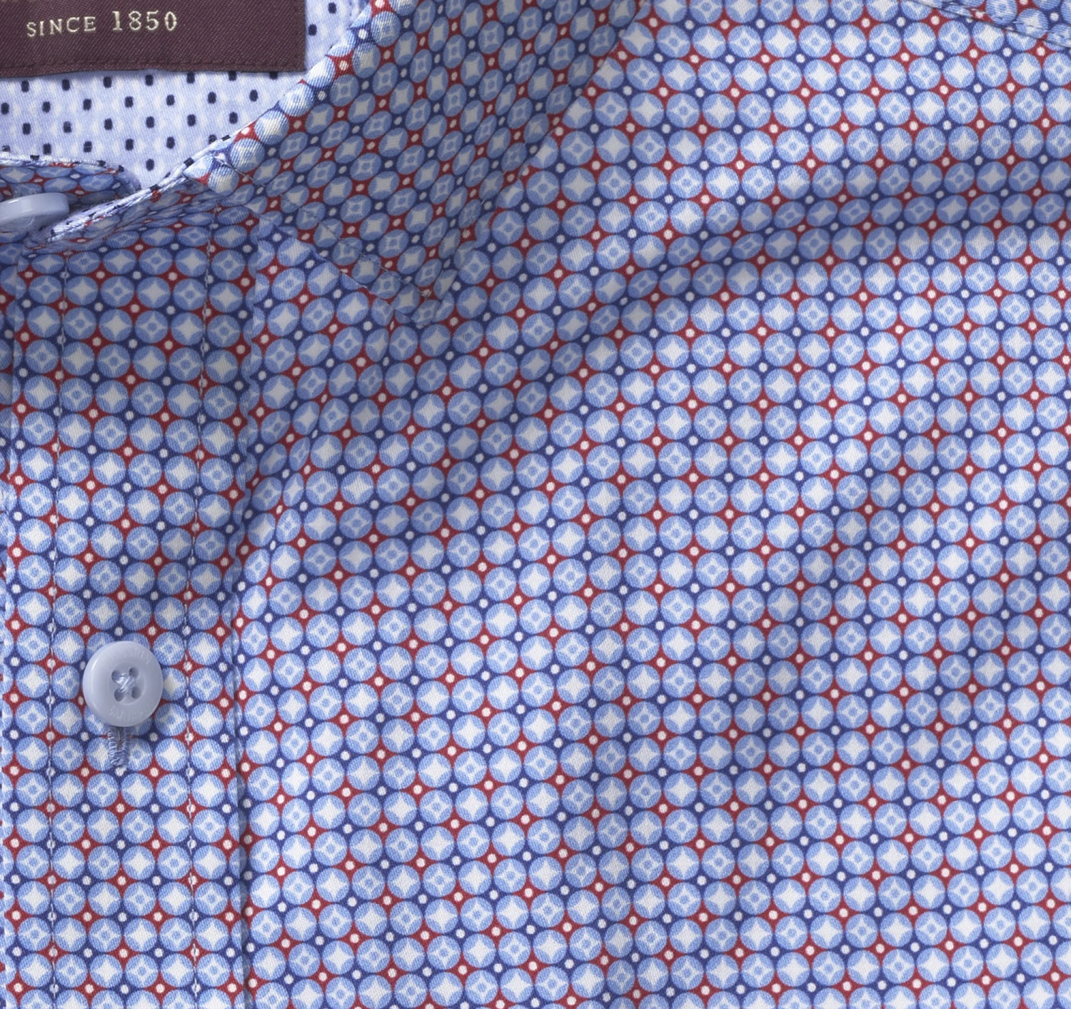- Point collar with hidden buttons for stay-in-place smoothness.