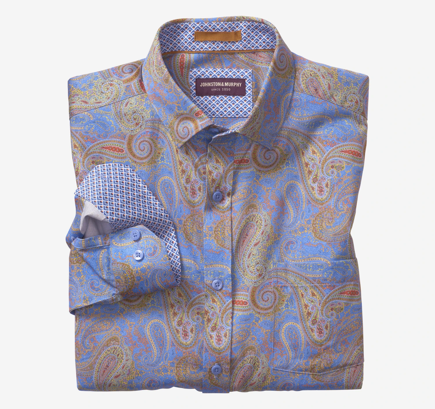 - Point collar with hidden buttons for stay-in-place smoothness.