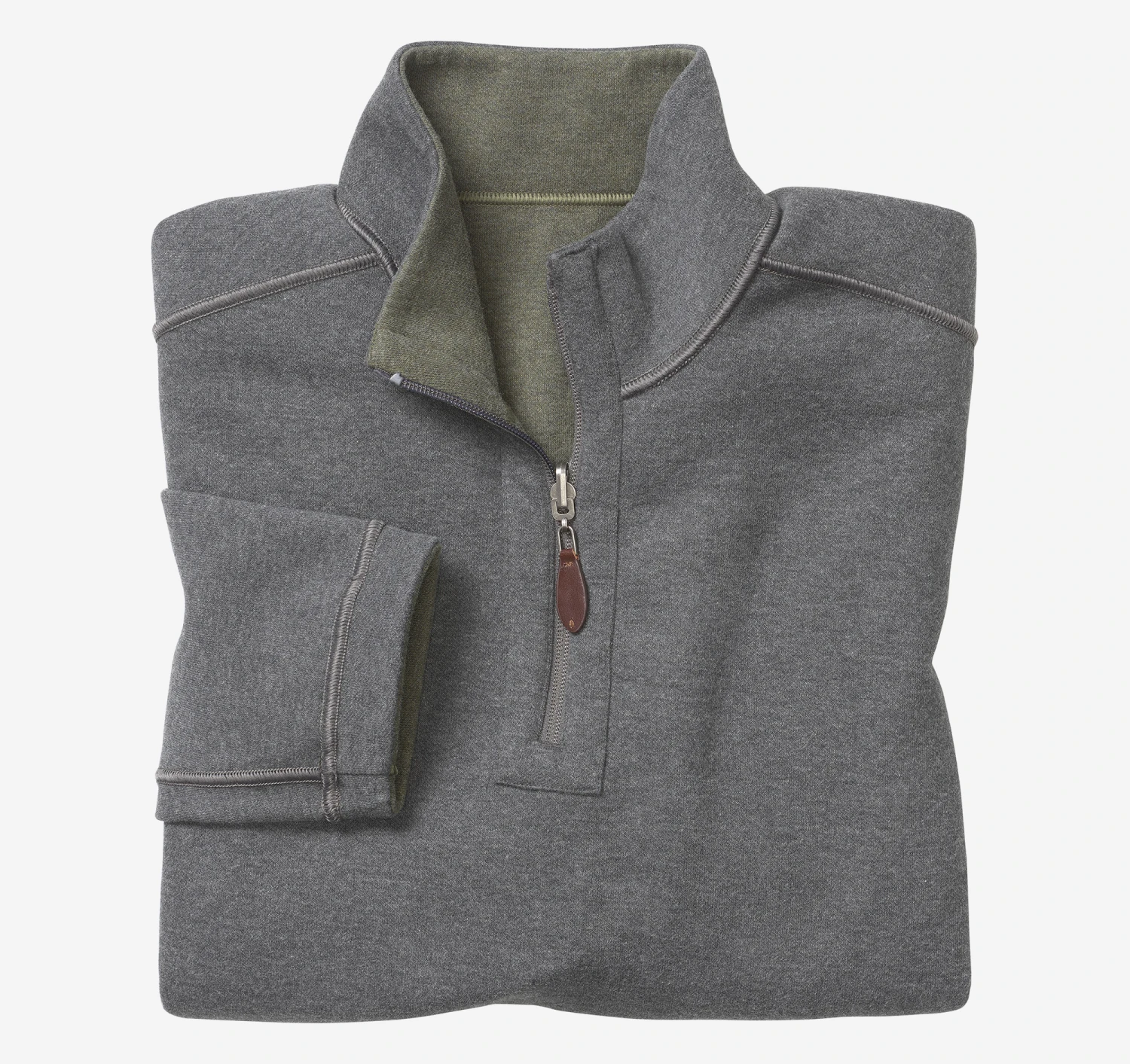 - Soft cotton-blend knit reverses from solid to coordinating heather shade.