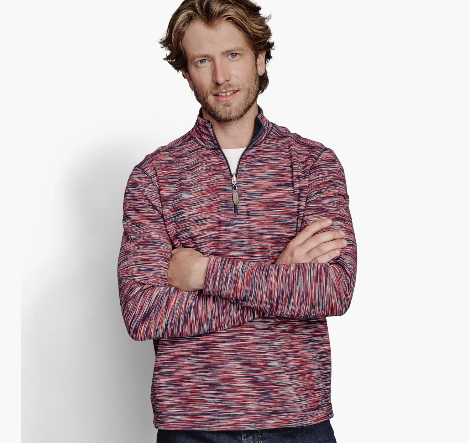 - Soft cotton-blend knit reverses from a rich space-dyed pattern to a heathered knit.