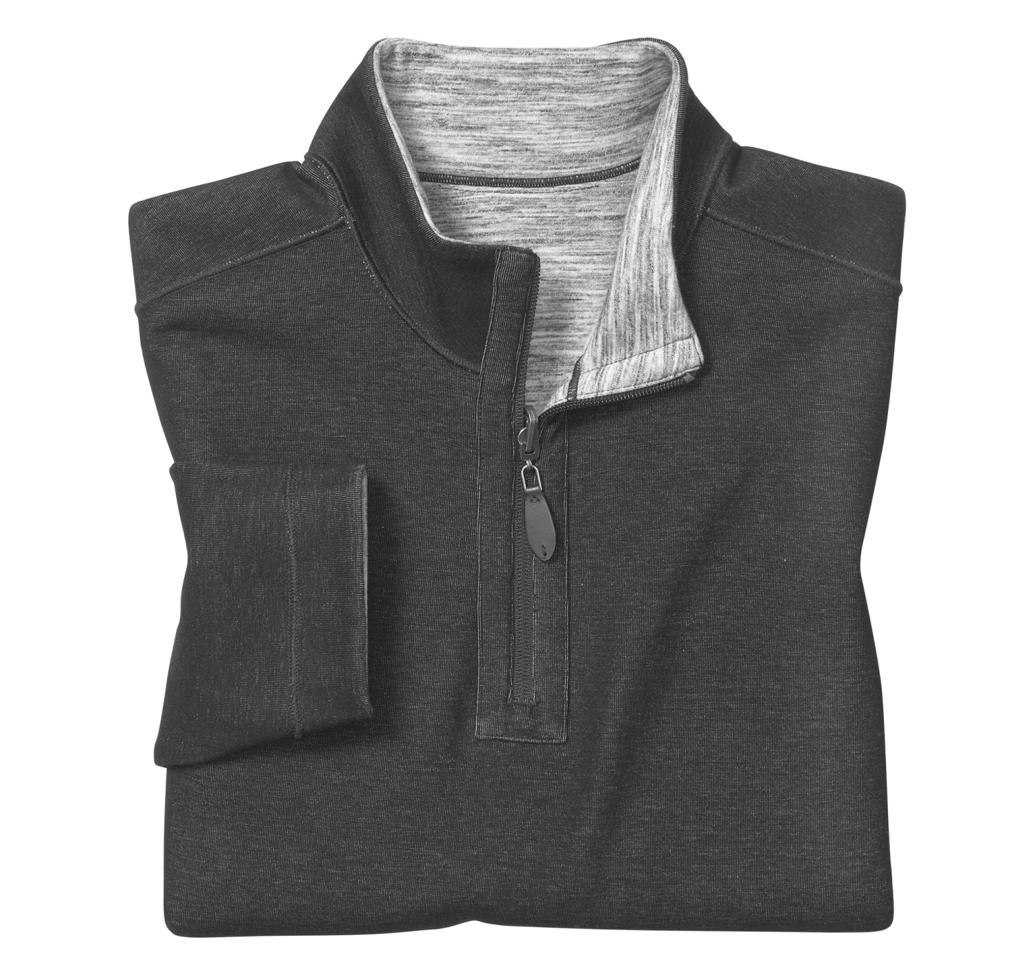 - Soft cotton-blend knit reverses from a rich space-dyed pattern to a heathered knit.