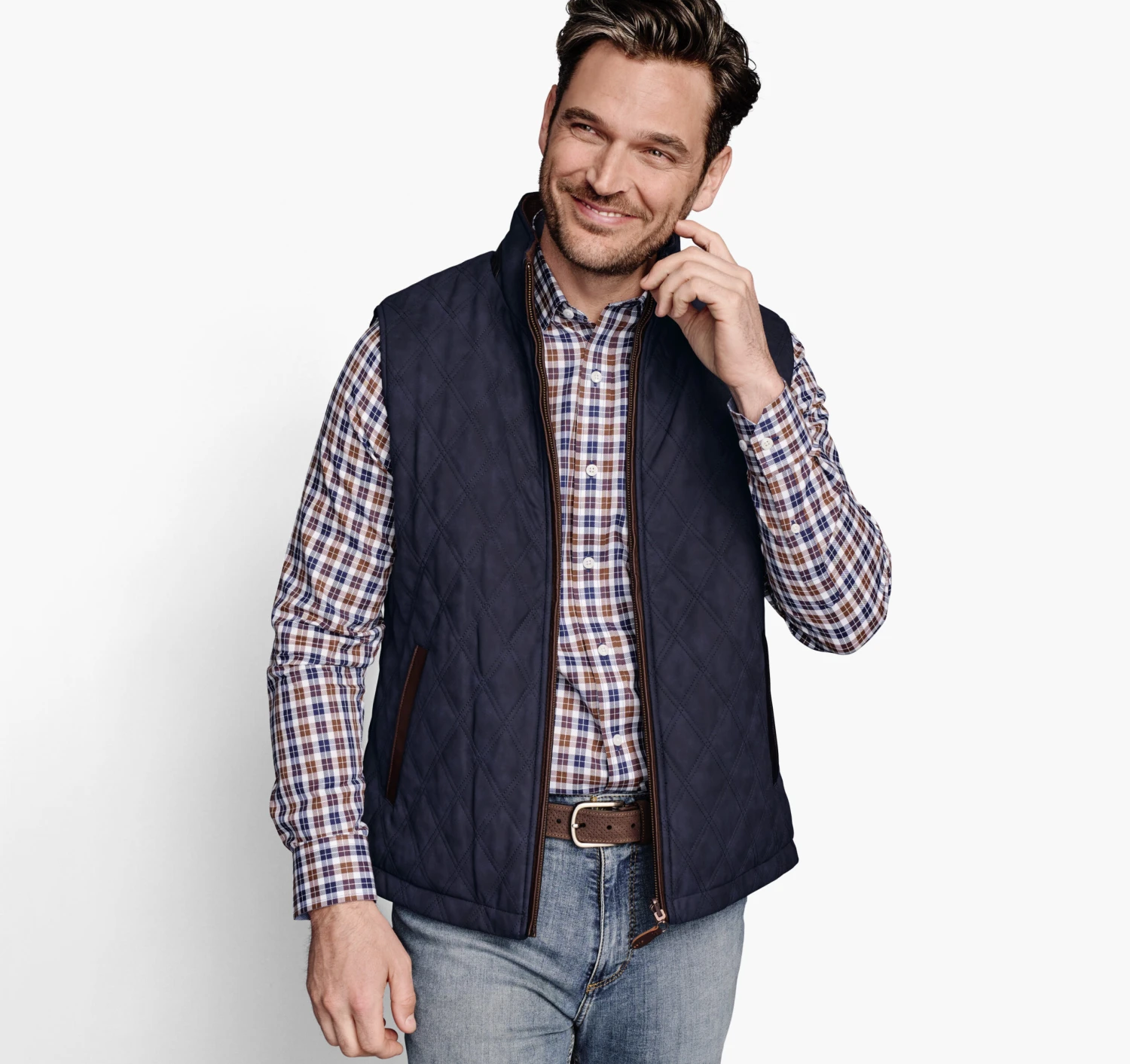 - Diamond-quilted faux leather with welt pockets reverses to windowpane plaid or houndstooth micro check.
