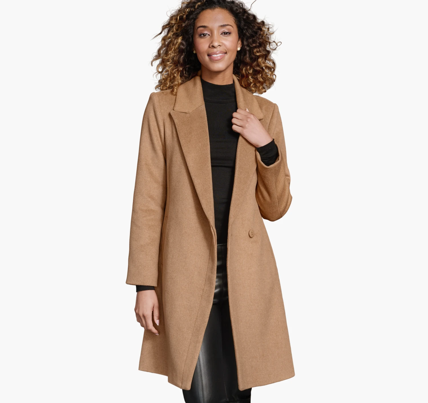 - Notched collar with a dramatic button-off ribbed-knit shawl collar that extends down the front.